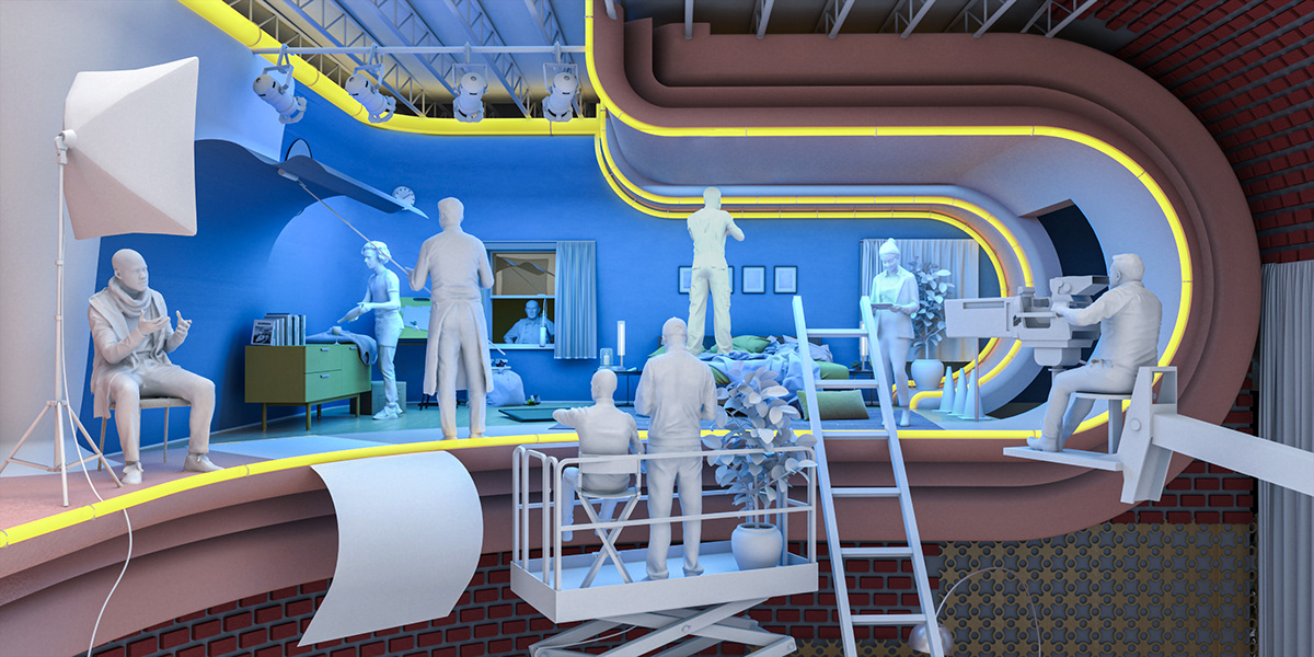 Amidst our aesthetic culture and the ever-growing struggle to “keep up with the Joneses,” we have become unhinged. Though shielded by white picket fences and lush hedges, digital media and artificial intelligence effortlessly puncture through the seemingly impermeable walls of our homes. This phenomenon is occurring as we are simultaneously experiencing a paradigmatic shift: the voyeuristic notion of gazing through an open doorway has subverted itself into the fear that nobody is watching at all. Fueled by our insatiable craving for attention and material items, we reveal even our most intimate spaces like film sets via the interface of online platforms. Through digital platforms such as zoom or Instagram, our altered perceptions of each other’s lives have driven this paradoxical relationship between privacy & voyeurism. We have become unconscious to the ways media interference has augmented our lives. This proposal investigates the shifting relationships between digital media, contemporary culture, and the built environment. The Jones Residence seeks to respond to these tumultuous relationships by forfeiting the sanctity of the home in an outward display. A house is portrayed as nothing more than a stage set, where those who inhabit the space are nothing more than just actors.