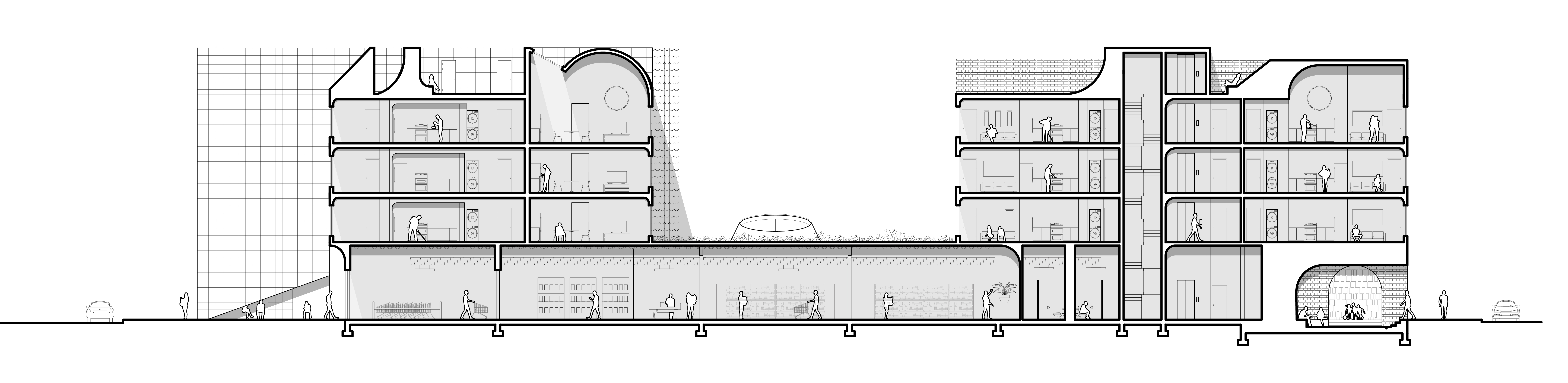 A 128,000 sqft housing facility, 1245 S Van Ness Ave explores the use of anthropomorphic shapes and the spaces they create to create a complex and varied social framework withparticipatory way of living. This is achieved by organizing nine distinctly shaped buildings, or characters, along the West and East elevations of the site, each holding separate cores and mechanical infrastructure for occupants. Selecting legs, bodies, and hats for these characters gives residents a sense of shared identity from the public street. As these shapes move into the site’s interior, they warp and intersect, allowing users to participate in the multiple characters — acting as places for repose, gathering, or amusement. The ground-level shapes forming the legs of the building characters create various small-scale spaces.