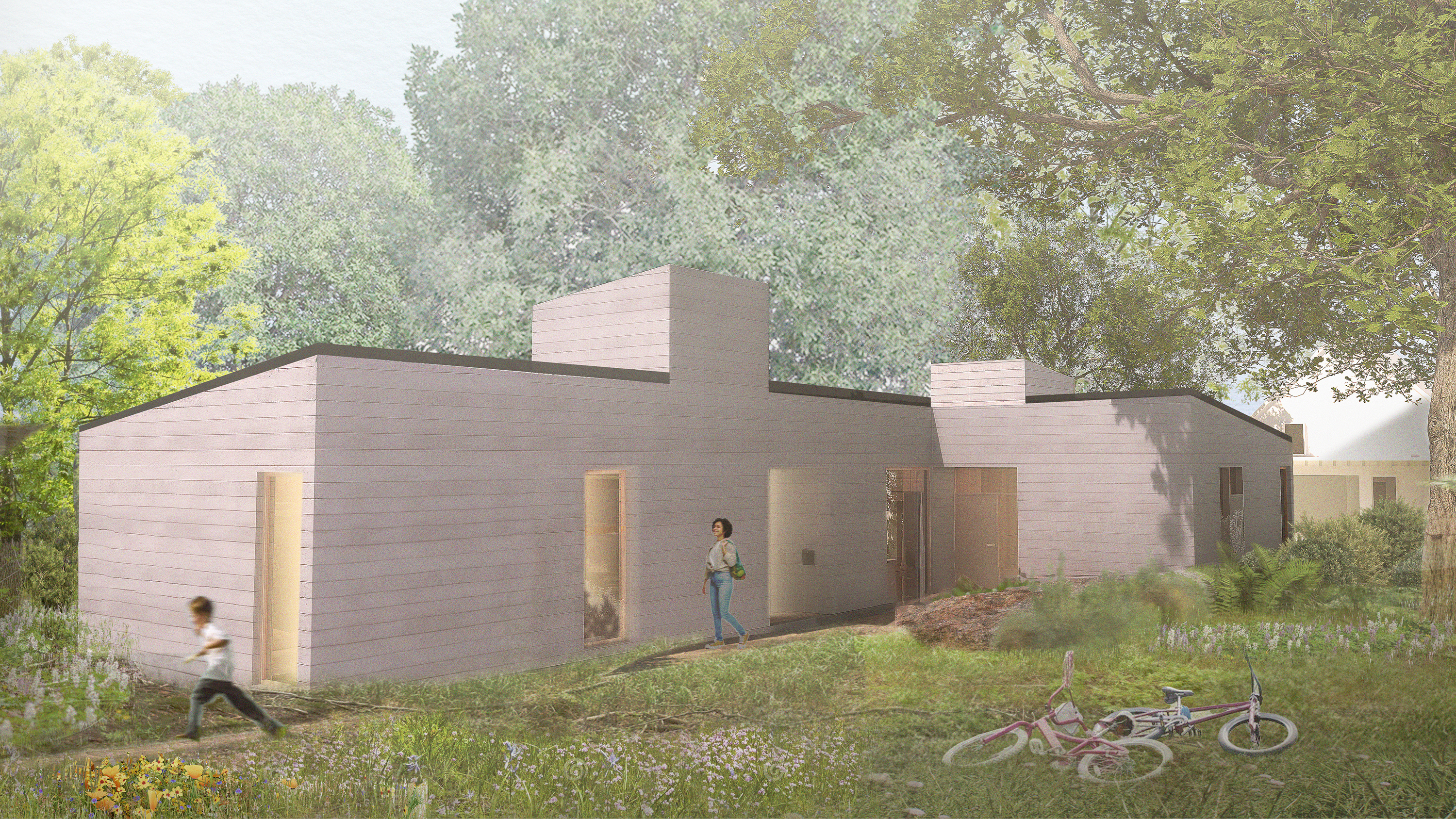 The form of the home is a simple L shape that consists of three distinct spaces, with generous thresholds forming the boundary between the two private units and the shared space in the center. These thresholds are both passageways and functional storage solutions, including coat closets, bookshelves, and media consoles, with the bathroom tucked away inside of them. The optimized cores become the “hearths” of each unit: the hearth as a symbol of one’s home was the inspiration to articulate everything the residents need in one convenient location. On the exterior, these hearth spaces are expressed through skylights that puncture through the roof, creating a sculptural beauty that carries through to the smallest detail of the home.