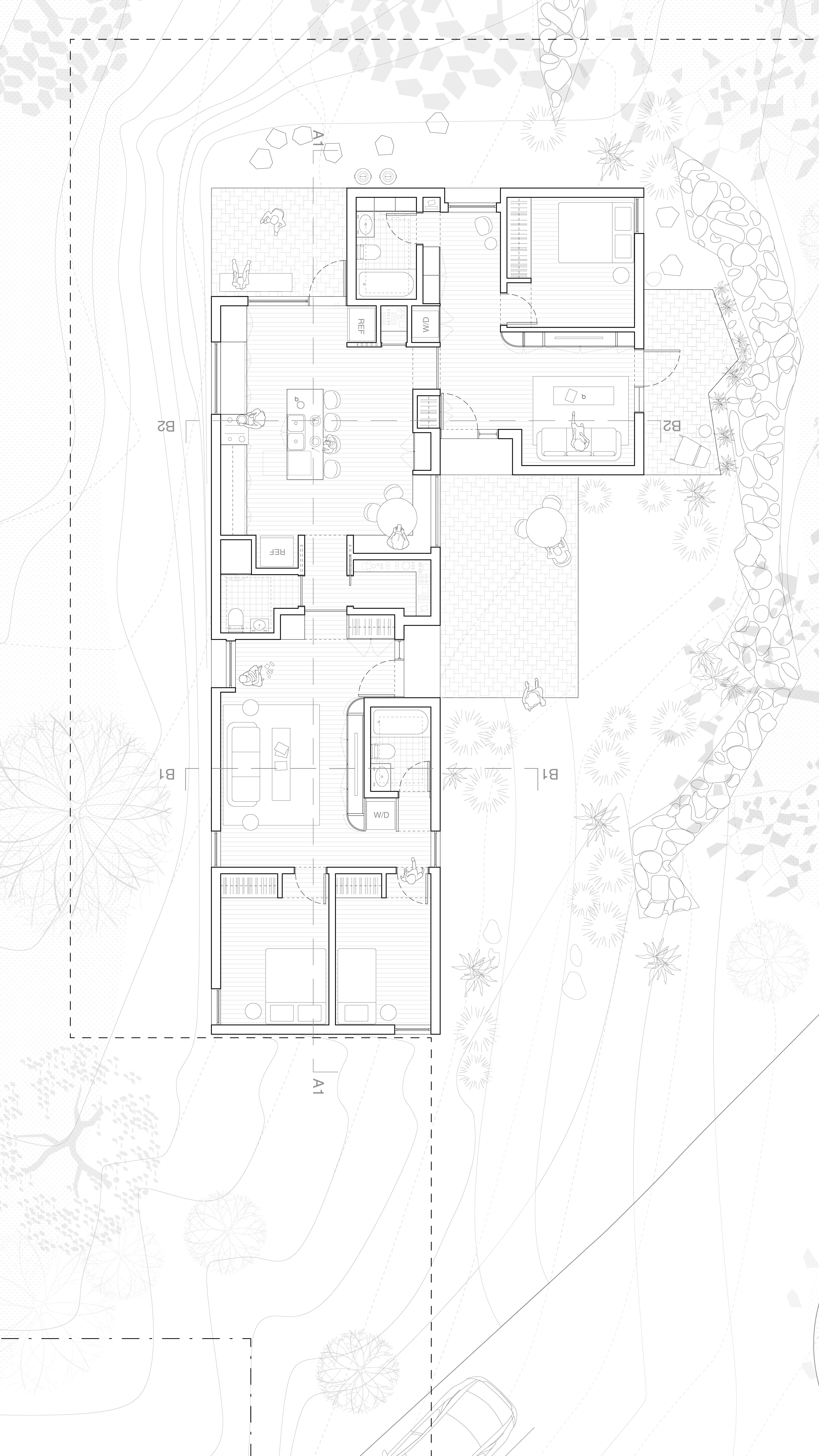 As a home with two families, the space is configured to simplify the lives of the residents. Living rooms are placed near the boundary to the shared kitchen, while the bedrooms are placed at the far ends of each unit, providing necessary separation for each resident.