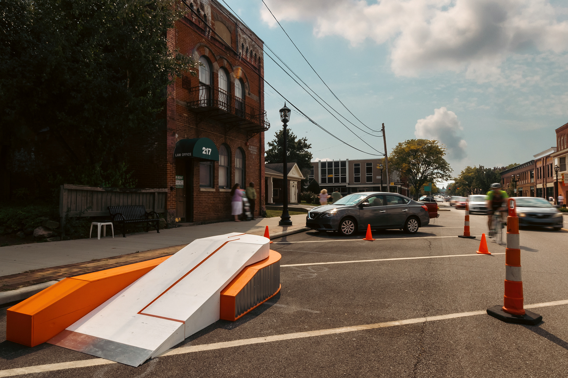 Drop-In investigates these themes as a small, grass-roots, urban intervention in the downtown area of Kent, OH. As a part of Park(ing) Day, a public participatory project where people worldwide temporarily repurpose curbside parking spaces and convert them into public parks, our team partnered with a local small business, Dirty Skate Company, to host the event. The installation sought to bring a community generally restricted in their public territory by designers together for a day of skating.